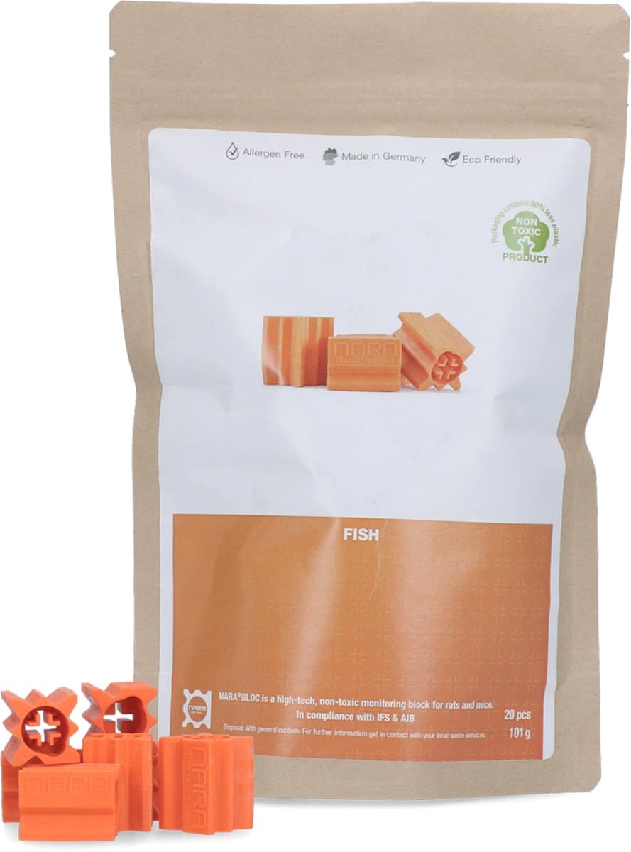 Návnada pre myši a potkany NARA LURE Ryba je moderné a ekologické riešenie pre efektívnu ochranu pred hlodavcami. Táto netoxická návnada je vyrobená zo špeciálneho ochuteného plastu, ktorý láka myši a potkany bez použitia alergénov alebo toxických látok.