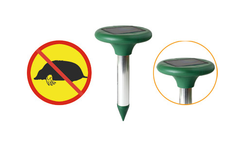 Solárny ultrazvukový odpudzovač krtkov, účinnosť až 350 m², solárny článok 90 x 70 mm, vyžarovanie vĺn v 30s intervaloch, frekvencia 400 – 1000 Hz, vstavaný solárny článok a nabíjačka batérií, vymeniteľná NI-MH batéria 1,2V / 600mAh, materiál výroby plast / hliníková tyč