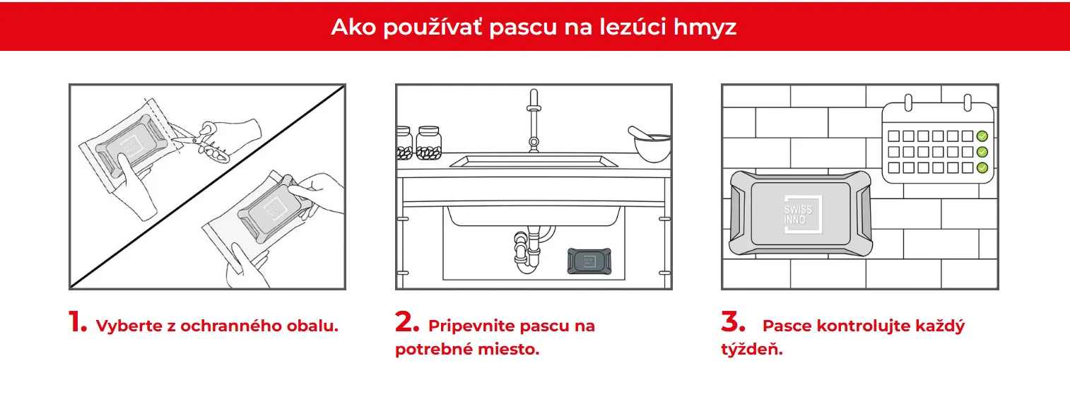 Na rozdiel od jedovatých pascí je Swissinno® bezpečná – neobsahuje žiadne klasifikované chemikálie. Jej používanie je hygienické a bezdotykové, čo z nej robí vhodnú voľbu aj pre domácnosti s deťmi a domácimi zvieratami.